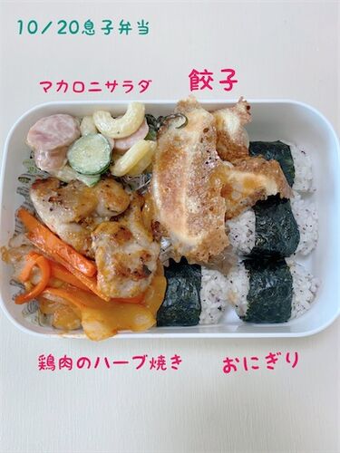 今週は水曜日のみお弁当 息子がなかなか寝てくれず また夜中にお弁当の下準備 マカロニサラダ おにぎりをにぎり 野菜をカット 3時間後に起床して 王将の冷凍餃子 失敗しないからラク♪ 鶏肉のハーブ焼きにして、おにぎりの海苔を巻いて出来上がり。 今週はバ…