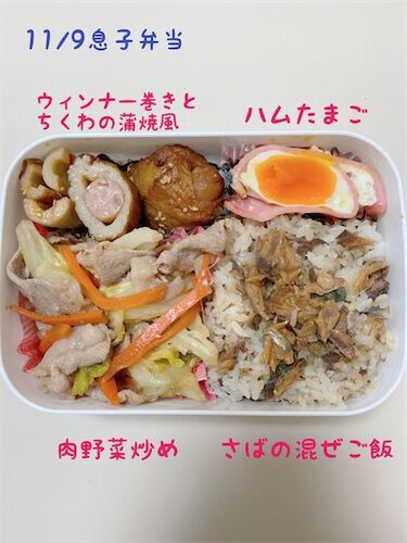 11/9野菜炒め 鯖缶で混ぜご飯 野菜炒めは中華だしとソースで仕上げました。 完食☆ 11/10残り物を詰めたタッパ飯 ご飯は納豆巻きにしました。 この日は息子の親知らずの抜歯手術でした。 待ち時間に、お昼持参しました。 親知らずに関してはまた書きます。…