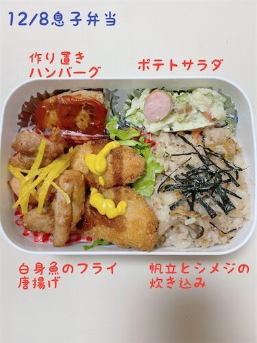 12/8唐揚げ 炊き込みご飯 しめじ,人参、ベビー帆立、油揚げ、生姜 冬は生姜たっぷり入れた炊き込みご飯が多いかも。 免疫力アップを意識して♪ 12/10お好み焼きオール冷凍食品 この日は、健康診断があって朝食抜き なので、朝のキッチンにいい匂いを残すわけ…