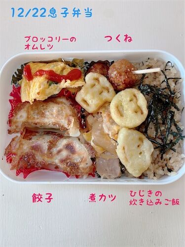 最後まで手抜き💧 レンチンしたブロッコリー🥦 オムレツにして 王将餃子を焼いただけ 後は、残りの煮カツ 冷凍のつくね レンチンで出来上がり。 今年最後のお弁当🍱 来年は4日からですが 休み中は買い物行けないし🥲 どーしよ。 今週もお疲れ様でした☕️